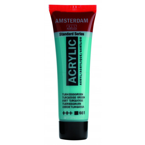 With 70 standard colours and 10 speciality colours in metallic and fluorescent. these high quality paints from the Amsterdam Standard Series offer everything an acrylic painter needs. The colour range includes both traditional and contemporary colours. pure primary colours for creating clear blends and unique shades for immediate use. Each colour has a very high level of lightfastness. due to the use of pure and non-fading pigments. The binder consists of 100% acrylic resin. ensuring a flexible and durable film once dried. Suitable for a variety of different surfaces. including wall paintings (due to being alkali resistant). Like all good acrylic colour. the Amsterdam Standard Series can be used directly from the tube. diluted with water. mixed with acrylic mediums and will dry quickly (within half an hour. depending on thickness of application). 20ml.