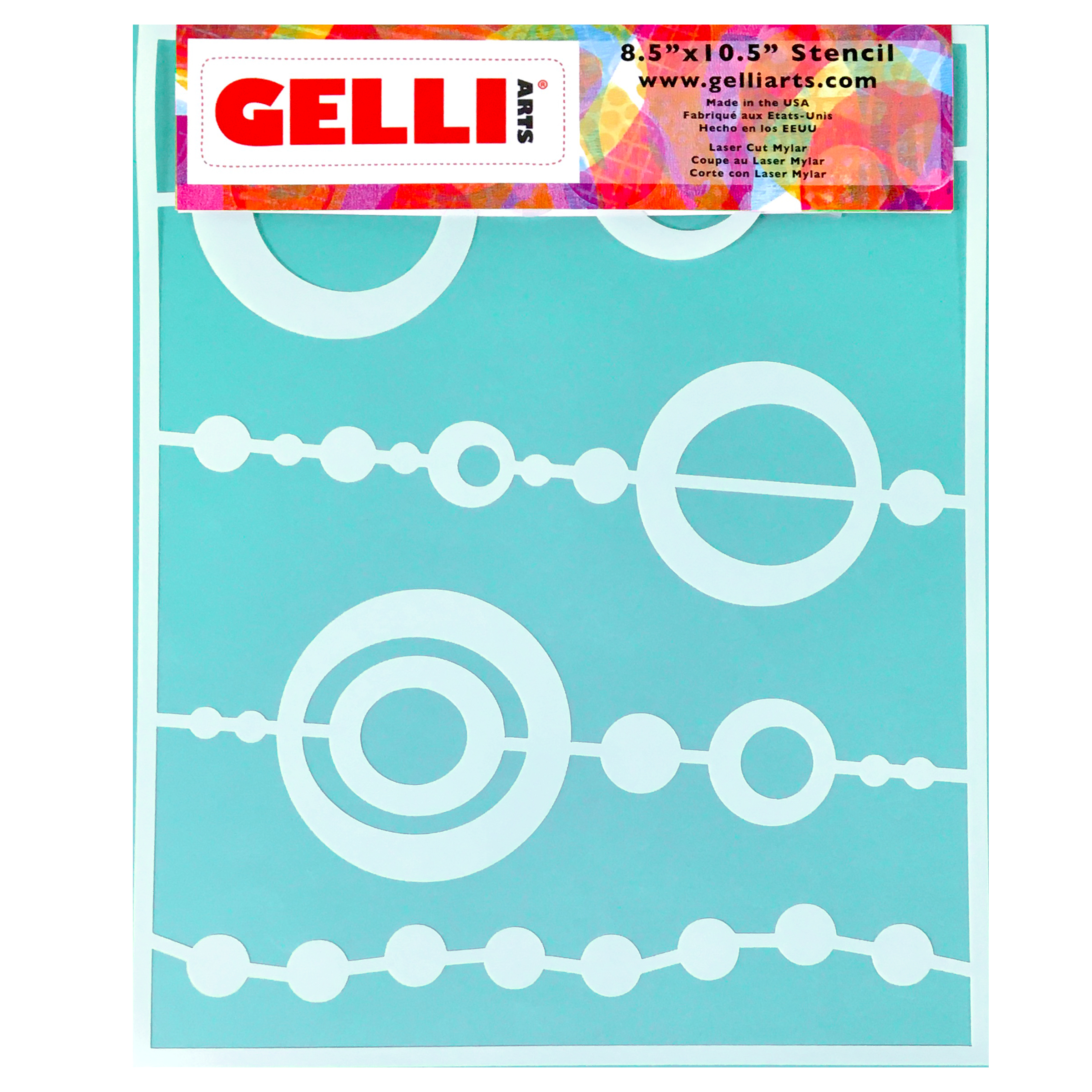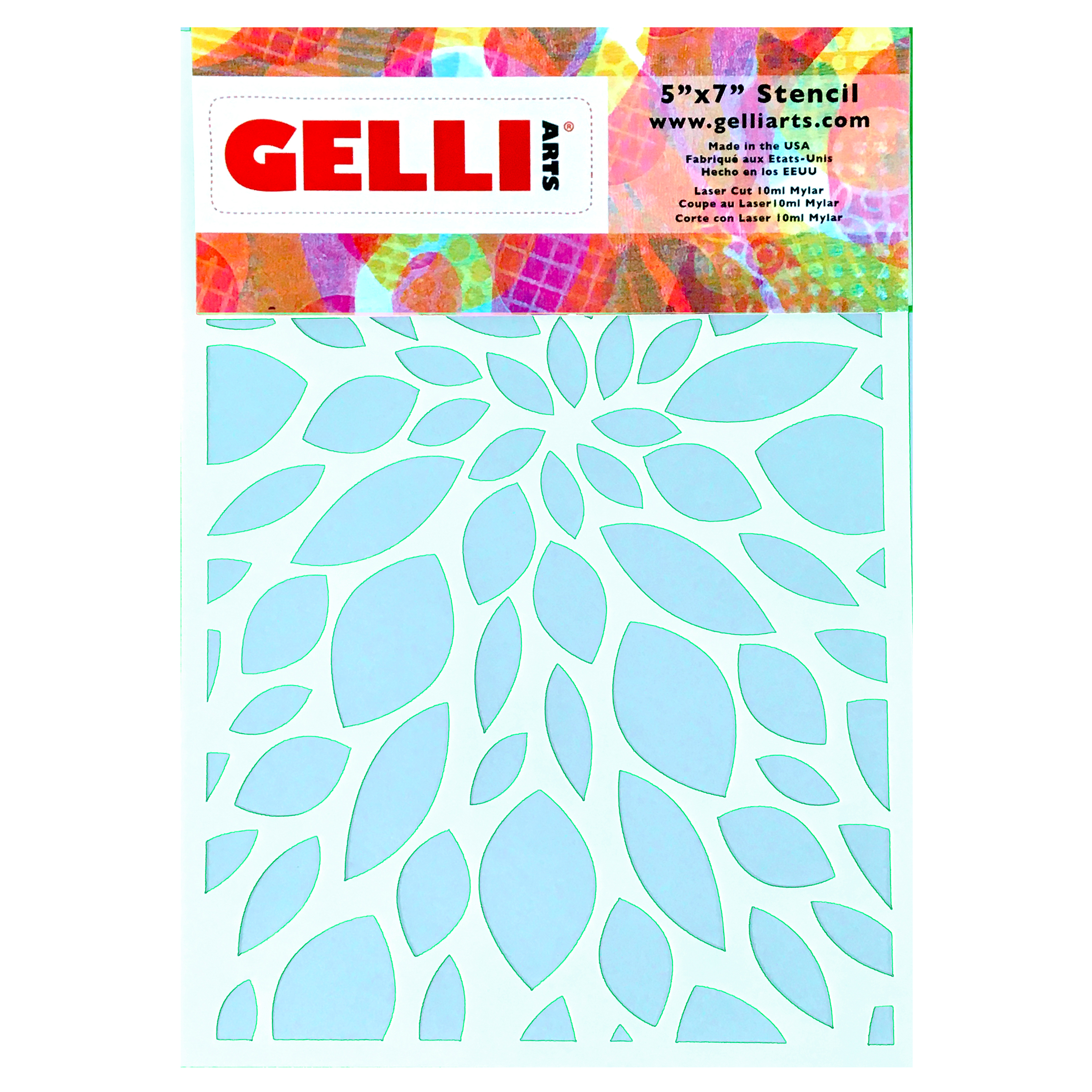 Stencil measures 5.5″ x 7.5″. Gelli Art stencils are made from 10mil mylar. They are durable and reusable.