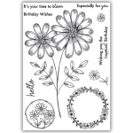 10 individual stamps comprising: large focal point daisy design with 2 flower heads and leaves, small circle design filled with daisies and small flower garland, individual daisy stem and flower head with a mix of 5 Sentiments: Hello, Wishing you the happiest Birthday, Especially for you, It’s your time to bloom and Birthday Wishes.